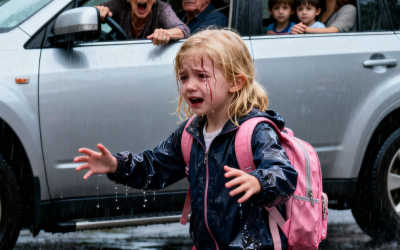 La lluvia caía a cántaros, fuertes y constantes, convirtiendo el aparcamiento de la escuela en un espejo gris borroso. Estaba…