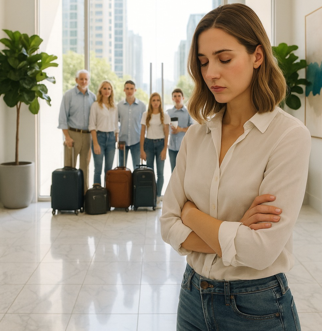 Afuera estaba toda la familia de mi esposo: su madre, sus dos hermanas menores, su hermano menor y la esposa de su hermano. Todos llevaban bolsas y maletas, con una sonrisa de oreja a oreja.