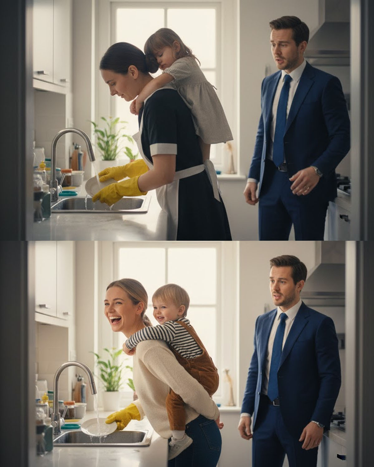 Su hija Valentina estaba en los hombros de la empleada, ambas cantando una canción infantil mientras lavaban los trastes juntas. La niña reía de una manera que él no veía hacía meses. “Ahora tallas bien aquí abajo, princesa”, decía Carmen, la empleada, guiando las pequeñas manos de la niña. “Asimismo, qué niña tan inteligente eres.” “Tía Carmelita, ¿puedo hacer burbujas con el jabón?”, preguntó Valentina con una voz cristalina que Carlos pensó haber perdido para siempre.